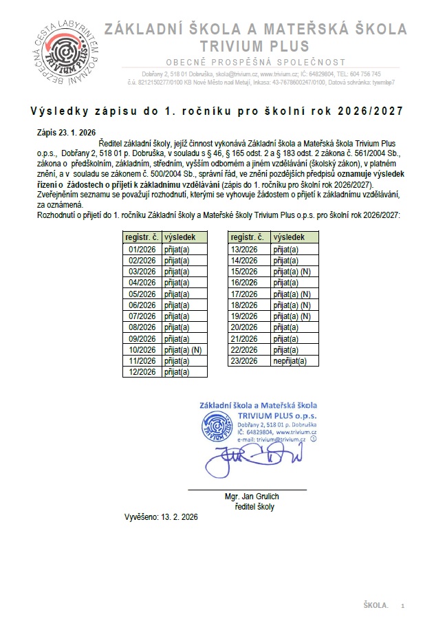 VÝSLEDKY ZÁPISU do ZŠ 2026